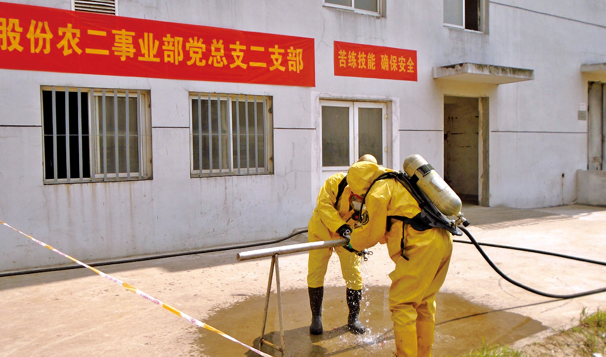 6月6日下午農(nóng)一事業(yè)部雙甘膦分廠組織氨回收送農(nóng)二事業(yè)部液氨管道泄漏預案演練,事業(yè)部總經(jīng)理孟長春擔任演練總指揮。6月19日,I草丙班與雙甘膦丙班聯(lián)合進行了液氨槽裝卸管道泄漏演練。演練前值長按照以往演練出現(xiàn)問題對原預案進行了修改,并且進行了泡沫消防炮、防化服穿戴專項訓練。