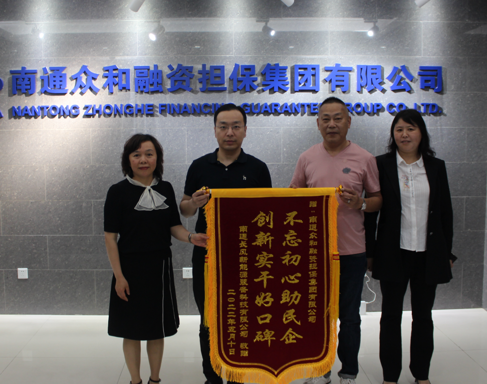近日,眾和擔(dān)保收到一面來自南通長風(fēng)新能源裝備科技有限公司送來的印有“不忘初心助民企,創(chuàng)新實(shí)干好口碑”的答謝錦旗,對我司提供暖心、貼心的擔(dān)?!凹皶r(shí)雨”表示誠摯感謝。